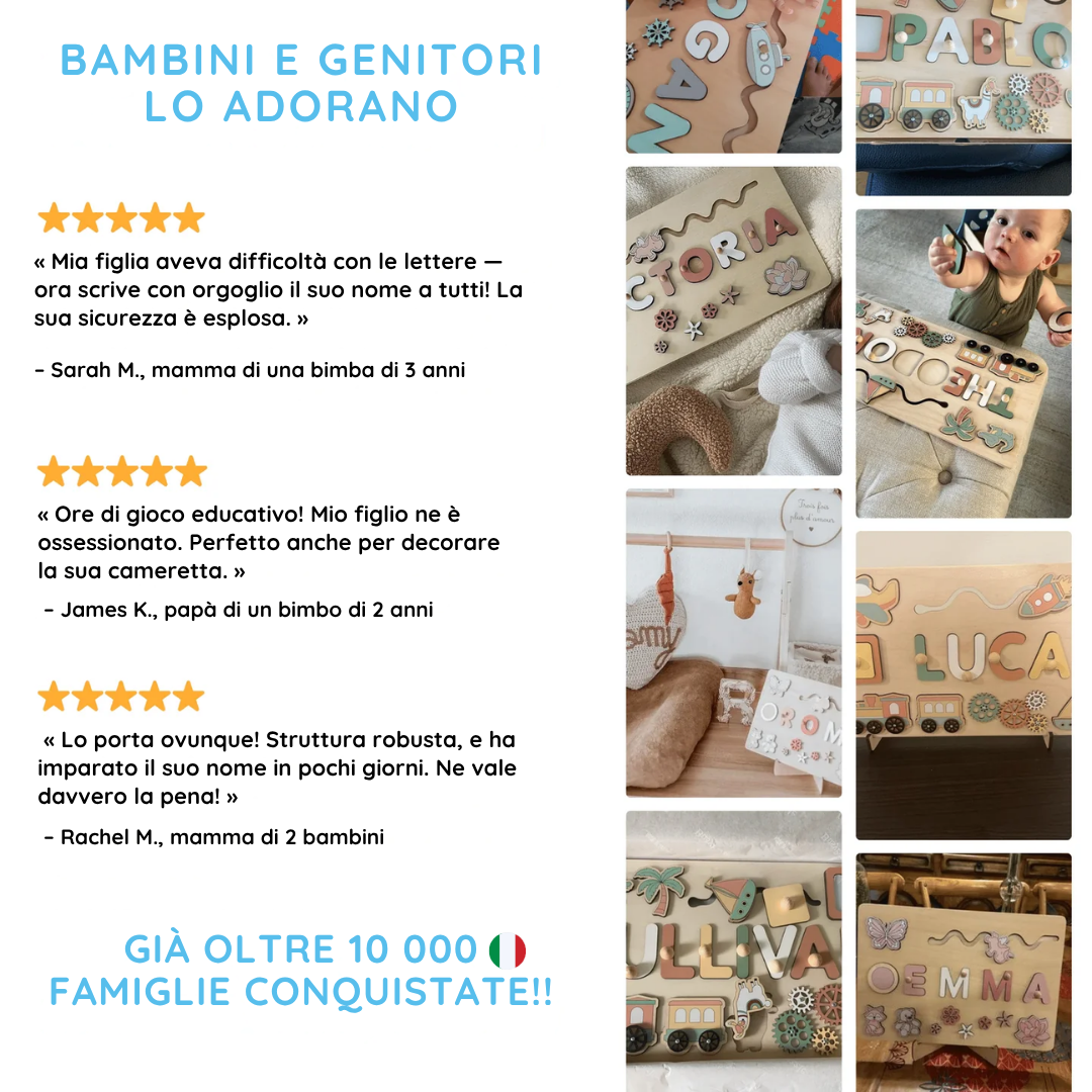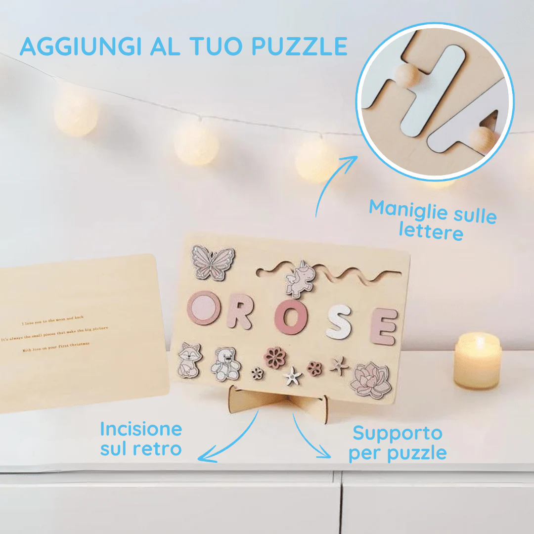 L’abbiamo scelto come regalo personalizzato per una nascita ed è stato un successo totale. Il legno è di ottima qualità, i colori delicati e la personalizzazione con il nome rende il puzzle un ricordo che resterà per anni.